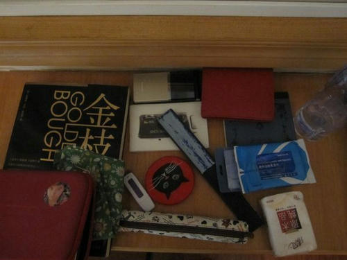 车上看的书(没错你们没有看错,就是《金枝篇》我是多么有臂力啊!)电子词典,手绢,手机钱包,湿纸巾,扇子,笔袋,手帐,记事本(就是记小段子或者摘抄笔记用)U盘,相方送的镜子!对了还有一瓶水……